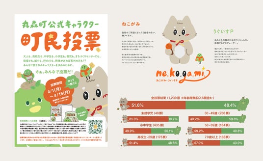 デザイン思考研修の実践編にて、丸森町の課題を別の視点から捉え、隠された町の個性や魅力を見つけるという観点で、丸森町らしさを反映したキャラクターを制作。研修内で導き出された2つのキャラクター候補について、70年の町政史上初の取り組みとなる全世代対象の町民投票を実施。園児や小・中学生などを含む投票の結果、僅差で丸森町公式キャラクター「ねこがみとうぐいすP」が誕生しました。