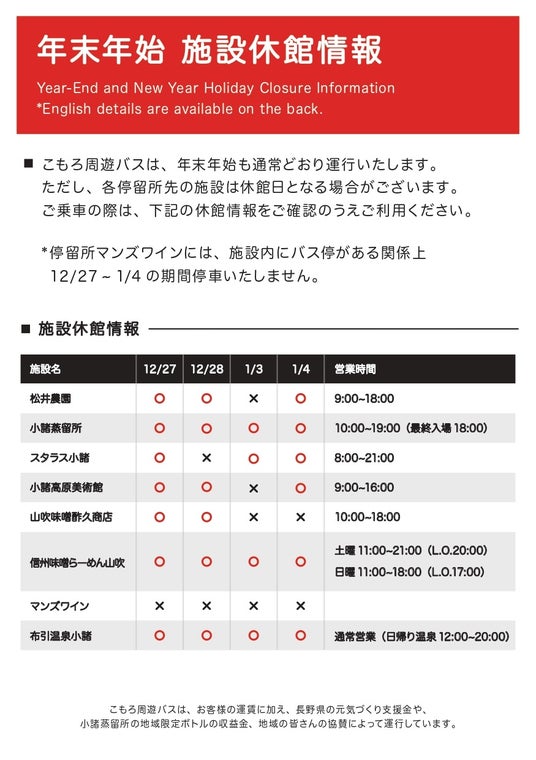 乗り降り自由で市内の観光スポットを巡る「こもろ周遊バス」は、下記の年末年始期間も休まず運行いたします。