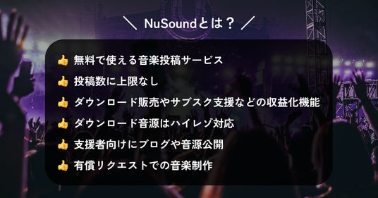NuSoundは、基本料金無料でご利用いただける音楽投稿サービスです。