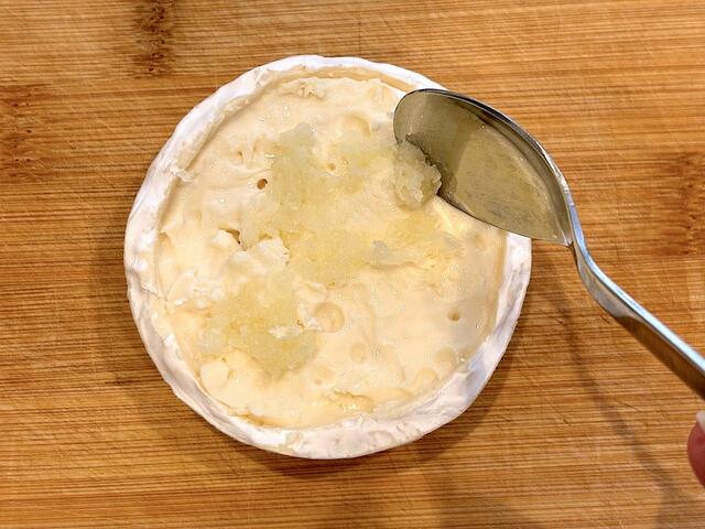 3. 切り込みを入れた内側のリンド(表皮)を丁寧に取り除く(リンドは小さく刻んでチーズに戻し、一緒に焼いてもよい)。