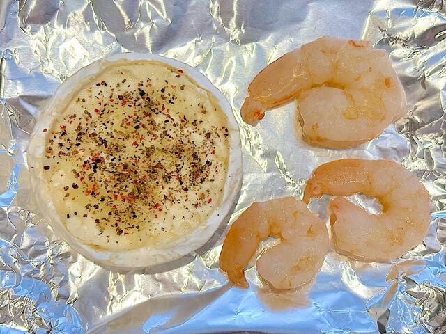 5. 3のチーズと塩をした海老をアルミホイルにのせて、オーブントースターで10分ほど、チーズがグツグツしてくるまで加熱する(このときアルミホイルに薄くオイルを塗っておくと、器に移しやすい)。