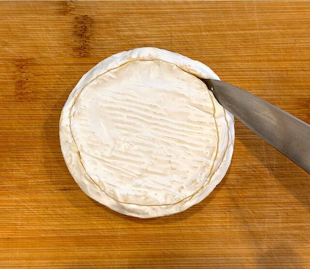 2. カマンベールチーズは、表面の端から5mmほどのところにナイフで切り込みを入れる。