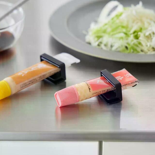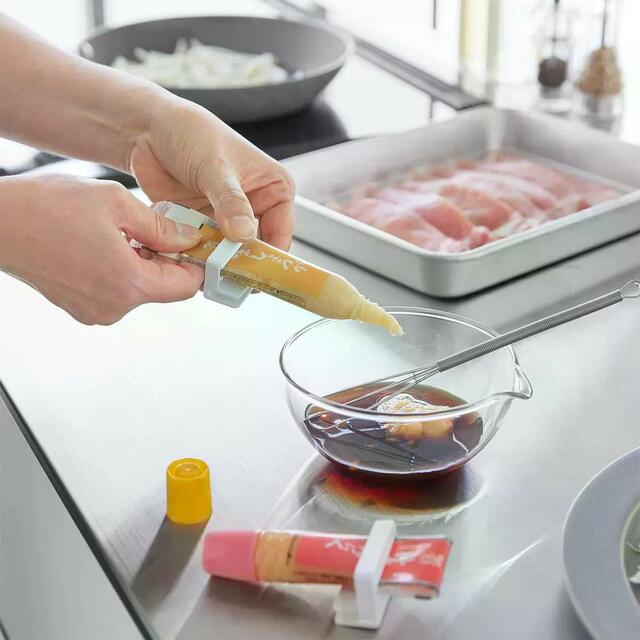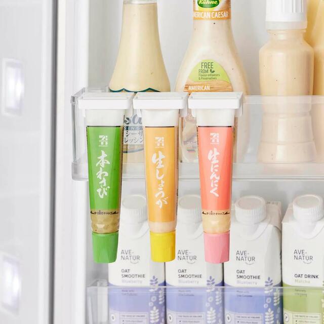 「引っ掛け絞れる薬味チューブホルダー」は、サイドポケットのフチに掛けて使えるホルダー。