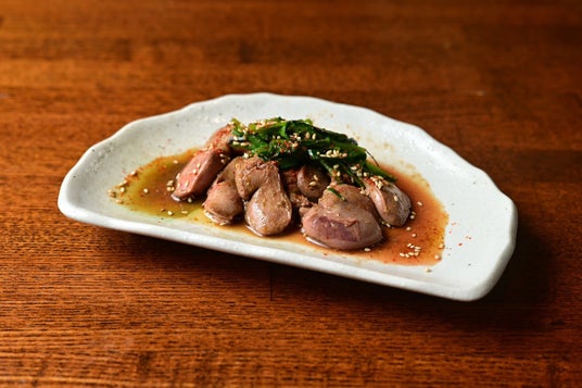 濃厚な脂がのった鶏レバーを丁寧に処理し、レバニラ風にレアで仕上げております。