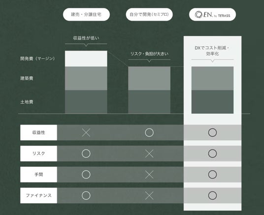 老後資産形成やインフレ対応として不動産投資への関心が高まる一方、建築費の高騰や人手不足により、収益性の確保が難しくなっています。また、収益性に加えて環境配慮や省エネ性能といった新たな要請にも対応できる投資商品は限られており、投資家にとって「良い選択肢が少ない市場」になりつつあります。■「EN. by TERASS」が提案する新しい不動産投資の仕組み