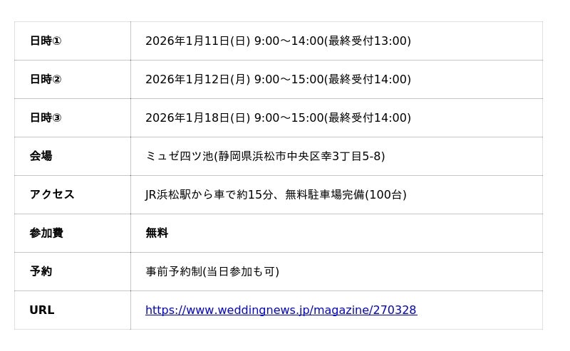 新しい年の始まりは、人生の新たなスタートを切るのにぴったりのタイミング。「浜松ウェディングフェスタ」では、一日で効率的に情報収集と体験ができるため、お正月休み明けからスムーズに結婚準備をスタートできます。