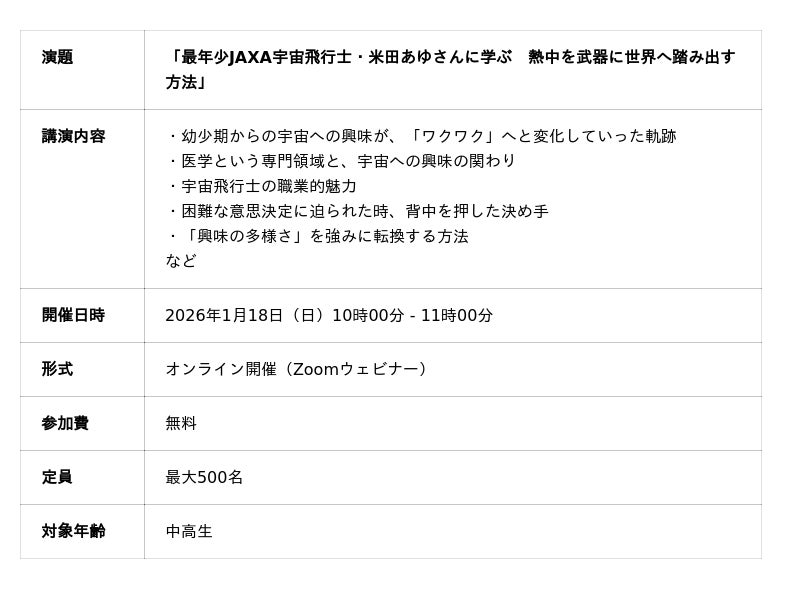 海外大進学をはじめグローバルで主体的な進路選択を支援する一般社団法人 52Hz(本社:京都府京都市、代表理事:梅澤凌我、以下「52Hz」)は、JAXA宇宙飛行士の米田あゆ氏をお招きし、中高生向け特別講演「最年少JAXA宇宙飛行士・米田あゆさんに学ぶ 熱中を武器に世界へ踏み出す方法」を、2026年1月18日(日)にオンライン(Zoomウェビナー)にて開催いたします。