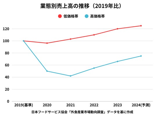 外食・中食市場における「低価格帯」vs「高価格帯」の業態別成長率比較