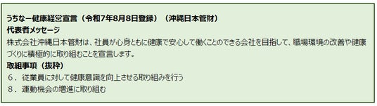 沖縄日本管財は2025年8月に「うちなー健康経営宣言」を行ったこともあり、初めて沖縄県主催のウォーキングイベントに参加しました。今回は1stステージに団体戦として従業員計6名が参加し、結果は125団体中42位(平均歩数6,602歩/日)でした。これまで歩く習慣のなかった従業員も参加でき、参加者からは「アプリで順位が表示され、ゲーム感覚で楽しめた」「日常生活で歩数が気になるようになった」などの感想がありました。沖縄日本管財は、これからも、社員が心身ともに健康で安心して働くことのできる会社を目指し、職場環境の改善や健康づくりに取り組んでまいります。