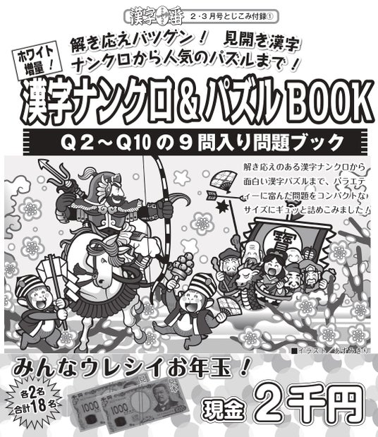 『漢字一番2・3月号』の特別付録は、さらにもう一冊あります。解き応え抜群の漢字ナンクロと人気のパズルを一冊にまとめた問題ブックです。特に今回は人気のホワイトナンクロを増量、お年玉として全問に現金プレゼントつき。この問題ブックを含め、2・3月号では選りすぐりの傑作ばかりを全46問掲載しています。