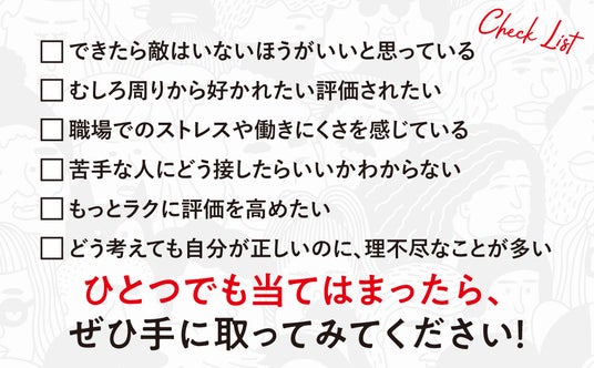 本書では、嫌われずに、風見鶏のようにもならずに、「自分の周りに敵を作らない」という思考法、立ち回り、コミュニケーション法を解説します。