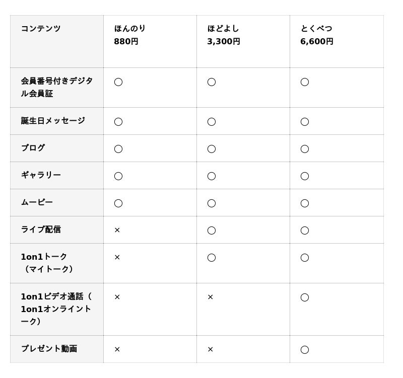 ▼プラン加入特典 コンテンツ比較表 ※価格は全て税込み