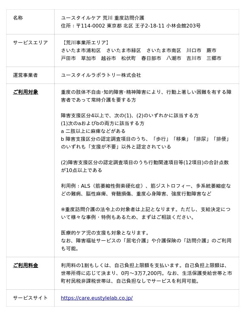 「すべての必要な人に、必要なケアを届ける。」をミッションに、重度訪問介護事業を中心とした包括的介護福祉サービスを全国に届けるユースタイルラボラトリー株式会社(本社:東京都中野区、代表取締役:大畑健)は、2025年12月1日(月)より、重度障害者向けの訪問介護事業所「ユースタイルケア 荒川 重度訪問介護事業所」を新規開設いたしました。