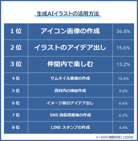 今回、オンラインイラスト教室を運営するアタムアカデミー( https://atam-academy.com/ )は、現在の利用実態を客観的に把握するために、生成AIイラストを作成したことがある500人にアンケート調査を実施。その結果をランキング形式でまとめました。
