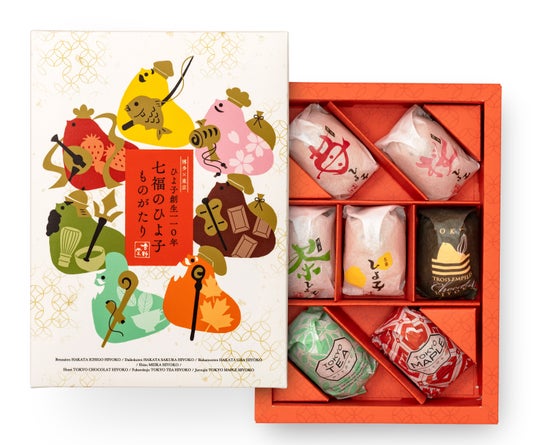 名菓ひよ子はもちろんの事、博多ひよ子の地域限定商品、冬限定のかわいい『苺ひよ子』、夏限定のさわやかな『茶ひよ子』、春限定の美しい『桜ひよ子』、そして東京ひよ子の地域限定商品、おしゃれな『ショコラひよ子』、秋限定あま~い『メープルひよ子』、春限定薫り高い『紅茶ひよ子』が一同終結!! 地域も季節も違うそれぞれの『ひよ子』が一度に集まった箱の中は、まるで七福神を乗せた宝船のよう!新年にピッタリな、華やかなパッケージが目印です。