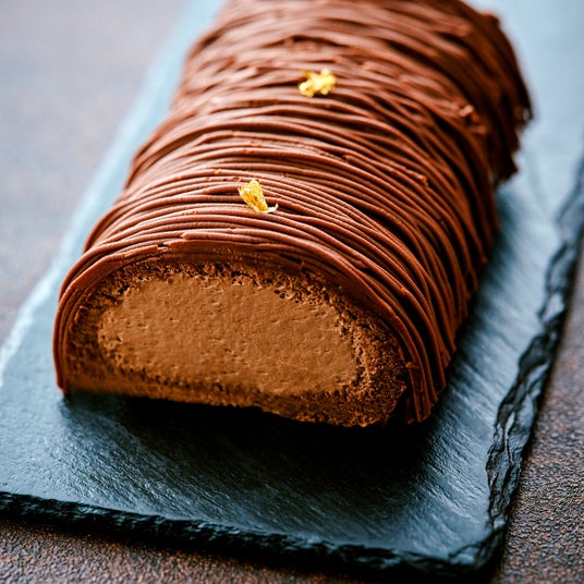 チョコレートスポンジで軽やかなチョコレートクリームを巻き込み、周りにほんのりビターなチョコレートガナッシュを絞りました。チョコレート好きにぜひお召し上がりいただきたい一品です。