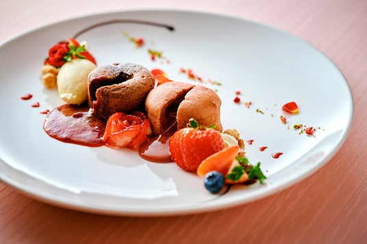 チョコレート生地で焼き上げたフォンダンショコラには甘酸っぱいいちごソースを、ピンクに色づいたホワイトチョコレート生地のフォンダンショコラには、なめらかなストロベリーガナッシュを忍ばせました。異なる味わいの2種類を1度に食べ比べていただけるスイーツプレートです。プレートを彩るフレッシュないちごには、奈良県産の希少なオリジナル品種「古都華」を使用しています。