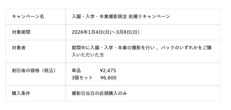 対象期間内に入園・入学・卒業撮影をご利用いただき 、撮影データと商品がセットになったパックをご購入いただいたお客様に限り 、限定キーリングを割引価格でご購入いただけます 。