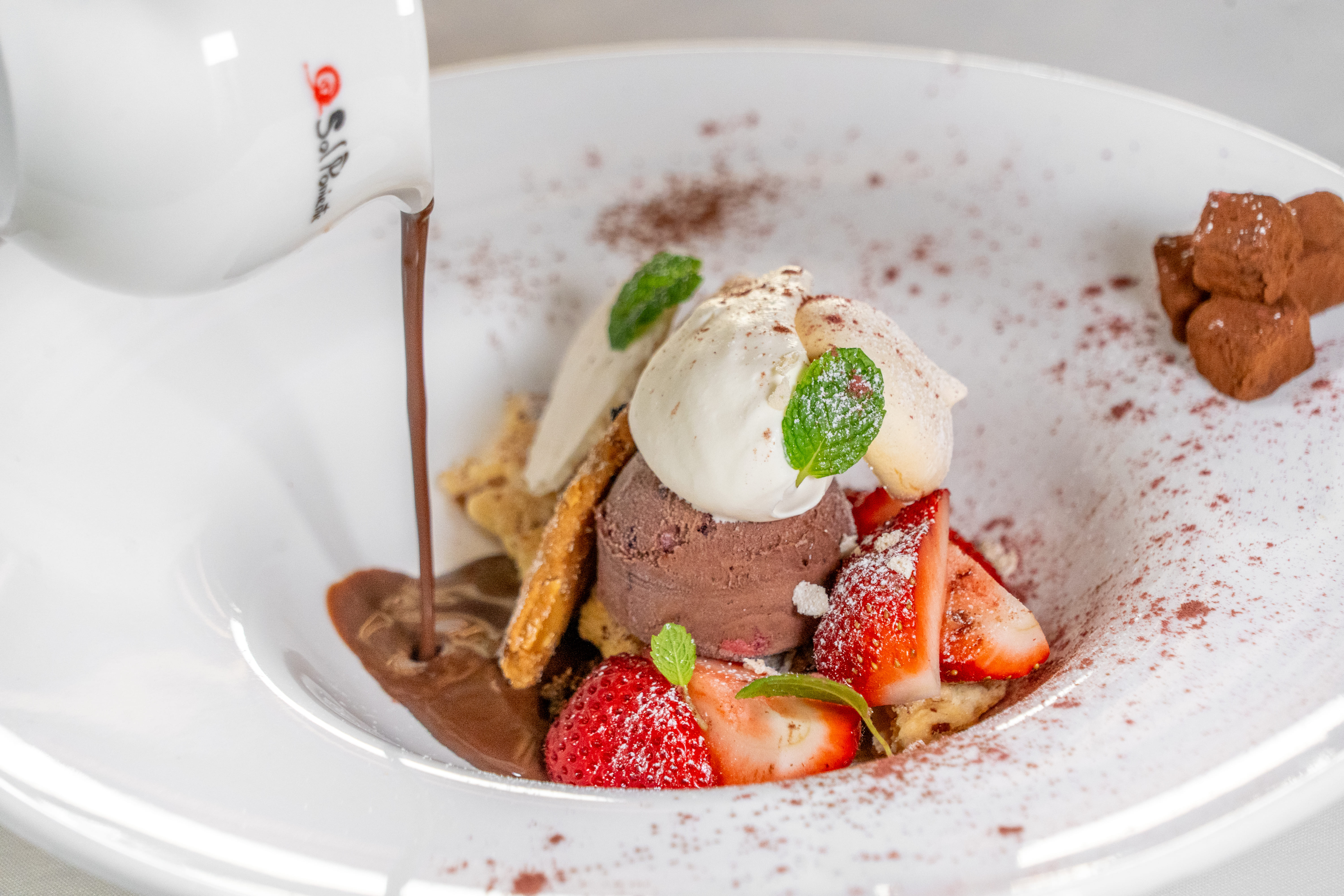 しっとりとした焼き色の美しい生地には、カラメル、カマンベールチーズ、エダムチーズを合わせました。さらに、ほんのり塩味のあるゴルゴンゾーラチョコレートをアクセントに加え、しっかりとした味わいに仕上げています。