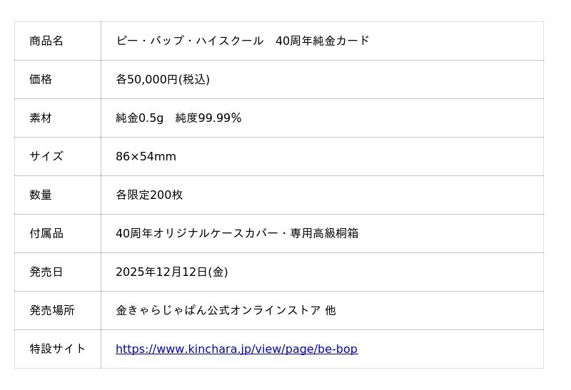 BICO・GHI株式会社が展開する金きゃらじゃぱんでは、映画公開40周年を記念して、『ビー・バップ・ハイスクール 40周年純金カード』を12月12日より、発売いたしました。