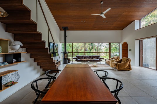 昭和40年代の高度経済成長期終盤、別荘地として開発がされたものの、手つかずだった土地を両親から受け継いだ施主。最大の特徴である吹き抜けは、南側の木々から差し込む光を取り入れ、非日常的な空間を演出しています。