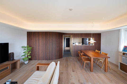 化学物質の影響が無い素材と防音対策を重視し、SUVACOの無料専門家紹介サービス《すばこと》をご利用いただいた施主夫婦。リビングから水回りまでを緩やかにつなぐ壁や、慎重に選ばれた床材・壁材がマンションリノベーションの魅力を高めています。30年後も古びない普遍的でシンプルな空間と、コントラバスをイメージした木のルーバーが印象的な住まいです。