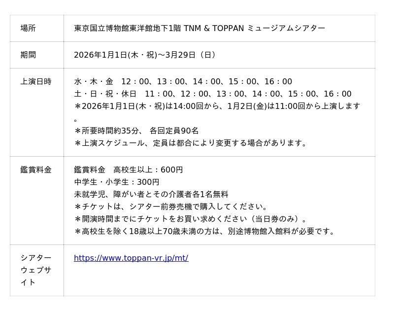 独立行政法人国立文化財機構東京国立博物館(所在地:東京都台東区、館長:藤原 誠、以下 東京国立博物館)、独立行政法人国立文化財機構文化財活用センター(所在地:東京都台東区、センター長:大美 慶昌、以下 文化財活用センター)とTOPPANホールディングス株式会社のグループ会社であるTOPPAN株式会社(本社:東京都文京区、代表取締役社長:大矢 諭、以下 TOPPAN)は、VR作品『洛中洛外図屛風 舟木本』を、東京国立博物館 東洋館内「TNM & TOPPAN ミュージアムシアター(以下 ミュージアムシアター)」にて、2026年1月1日(木・祝)から3月29日(日)まで再上演します。