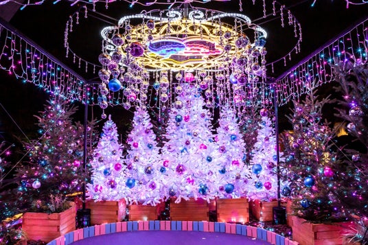 「Twinkle GARDEN」のエリアは、フォトジェニックな空間で、ピンクと水色に輝く光と、リボンのオーナメントがかわいいホワイトツリーが広がり、キキ&ララの色とりどりの星空の世界を演出します。