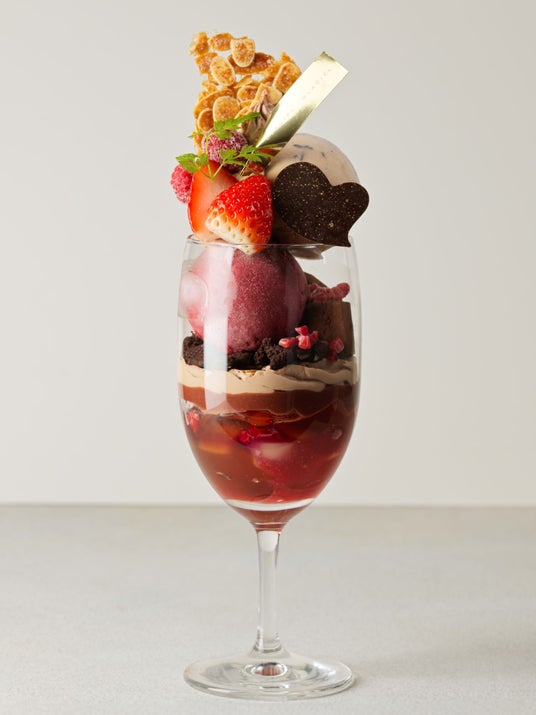 甘酸っぱいルージュソースに、上品な香りのアールグレイジュレとさわやかな洋梨、フランボワーズを重ね、すっきりとした後味を演出しました。サクサクのココアクランブルをしのばせ、食感のアクセントをプラス。奥深い味わいのフランボワーズガナッシュとシャンティショコラを絞り、生チョコレートを添えることで、コクと程よいミルク感をご堪能いただけます。華やかな「ソルベトリプルベリー」と、濃厚な「グラスアールグレイショコラオレ」を飾った、冬限定パルフェで至福のひと時をお楽しみください。