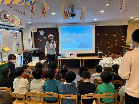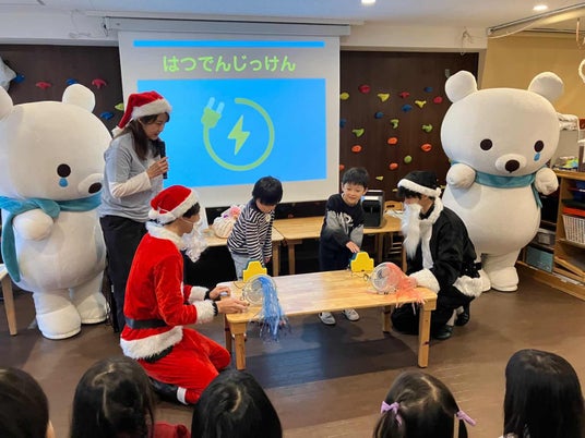 ワークショップでは、北極グマのキャラクター「そら」と「べあ」のお話を通して、地球温暖化や自然エネルギーの大切さについて、子どもたちにもわかりやすく学びました。キャラクターの登場に、子どもたちは目を輝かせながら楽しそうにお話に耳を傾けていました。