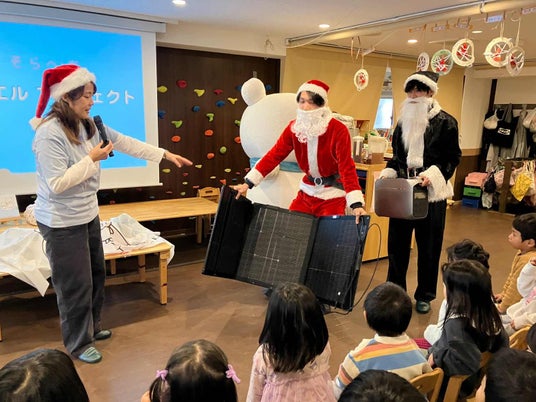 また、今回賛同企業である株式会社G&ECO様より、園にソーラーパネルと蓄電池をご寄贈いただきました。自然の力を活かした電気の仕組みに触れることで、子どもたちが環境問題やエネルギーの大切さに関心を持つきっかけとなることを期待しています。5歳児ひまわり組の子どもたちは、スタッフの方から出されたクイズにも積極的に参加し、正解すると嬉しそうな笑顔を見せていました。