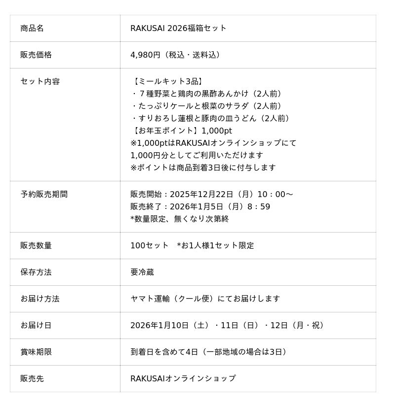 d130004-119-a28518e618ea408374c759327d6b0ffe.pdf 楽彩株式会社(本社:東京都足立区、代表取締役社長:大崎善保)は、2025年12月22日(月)より、2026年1月の特別企画として『RAKUSAI 2026福箱セット』の予約販売を開始いたします。本商品は、2025年下半期の売れ筋人気ランキングTOP2に、新商品を加えた計3品のミールキットを詰め合わせた豪華セットです。さらに、次回の買い物から使える「1,000ポイント」の特典付き。年末年始の食生活の乱れが気になる時期に、野菜たっぷりの健やかな食卓を提案します。