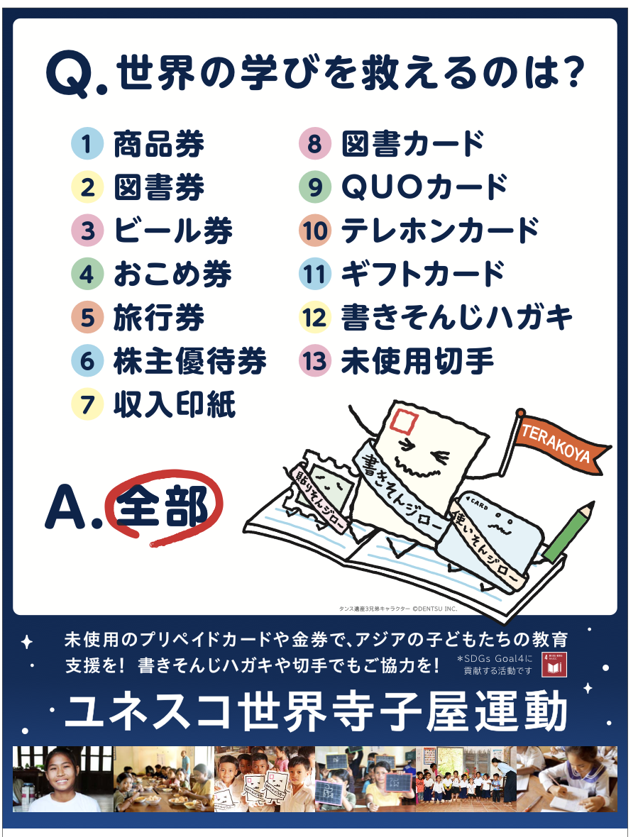 日本ユネスコ協会連盟は、書きそんじハガキや未使用の金券などを募金に変え、世界寺子屋運動に役立てます。