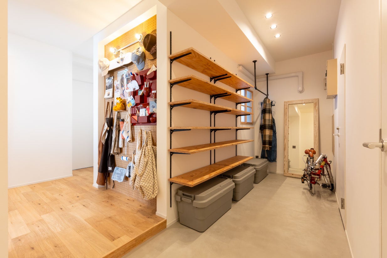 土間スペースや無垢の床材、躯体現しの天井など、マンションの骨格や素材の風合いを「活かせる」仕上げを採用。リノベーションらしいラフでありながら味わい深い空間をご体感いただけます。