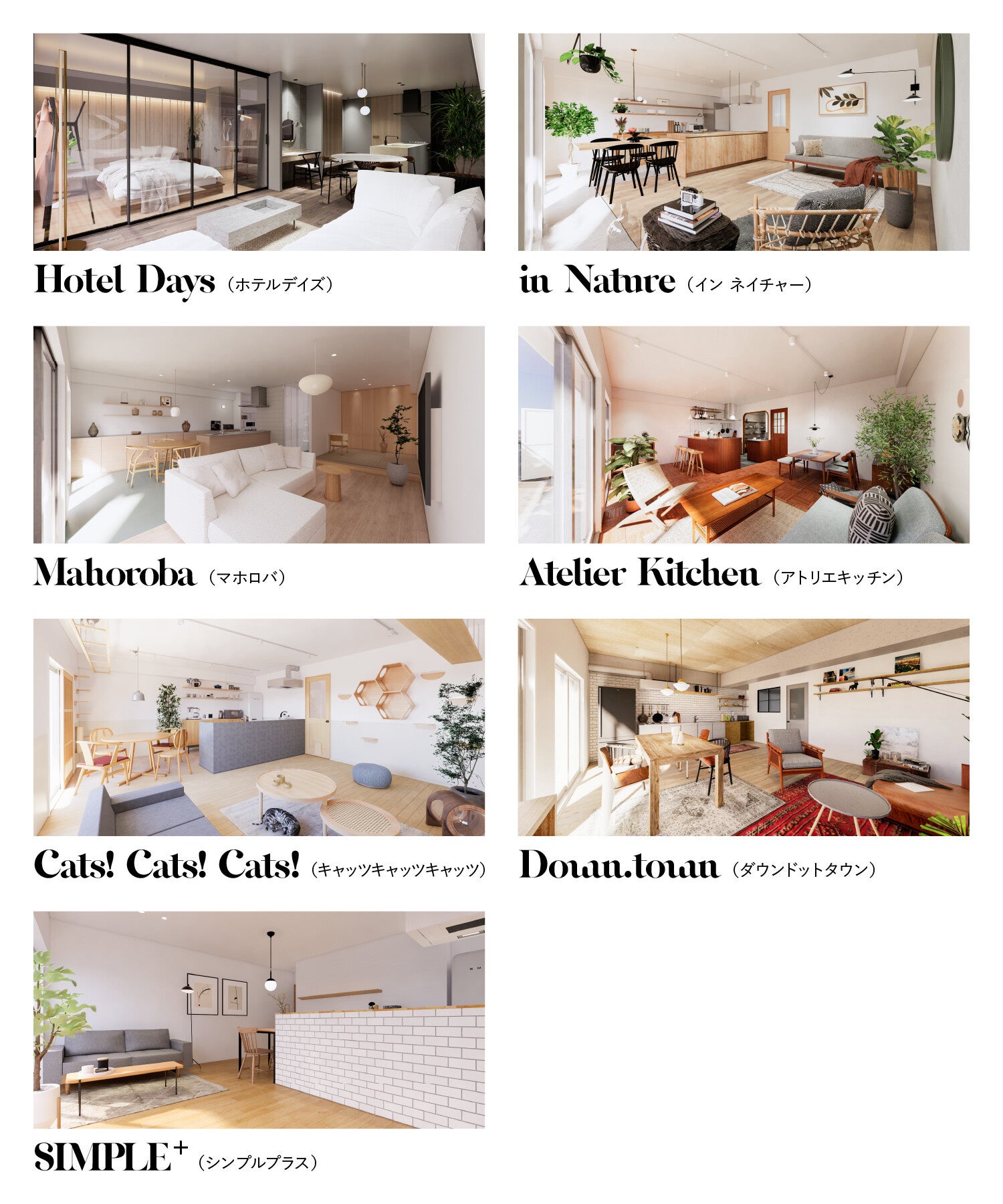 お客さまは、カウカモでの物件購入に合わせて、オリジナルデザイン7種類の中からお好みの1つを選択した上で、フルリノベーションか部分リノベーションを行うことができます。さらに、暮らし方に合わせて家具・植物のパッケージをカスタマイズして利用することも可能です。定額パッケージなので資金計画が立てやすく、パッケージを選ぶだけで統一感のあるリノベーションに仕上がります。