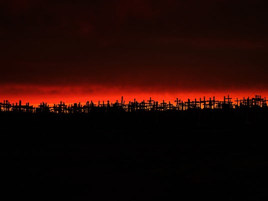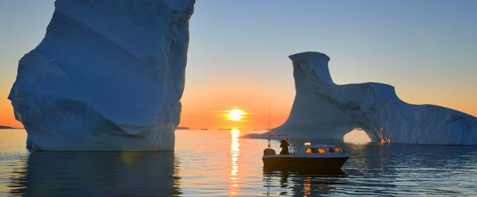 帰国を翌日に控えた夕方、空はこれまでに見たことのないほど赤く染まりました。ネイビーブルーの雲と水平線の狭間で帯状に輝く夕陽。その光を受け、海上に浮かぶ氷山はブルーとピンクの色彩を纏い、幻想的な表情を見せました。撮影を終え、暗闇の中を下山する途中、腰塚氏が辿り着いたのは、19世紀末から20世紀初頭に使われていたイヌイットの古い墓地でした。無数の十字架のシルエットと沈みゆく夕陽を前に、この地で自然とともに生きてきた先人たちの存在を強く感じたといいます。