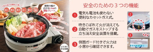 ホットプレート×グリル鍋 普段使いできて災害用にも。圧力感知安全装置、容器装着安全装置、立ち消え安全装置付き。