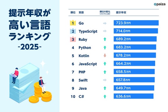 2025年の調査において、プログラミング言語別の平均年収ランキングでは、Goが3年連続で1位となりました。2位にはTypeScript、3位にはRubyが続いています。