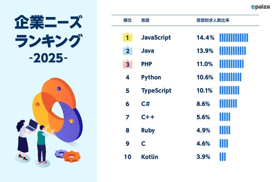 ※「転職で企業からニーズが高い言語ランキング」(言語別求人数比率)調査方法:2025年に「paiza転職」で掲載された求人票に占める各言語の割合を集計、言語別求人数比率に従いランキングを作成