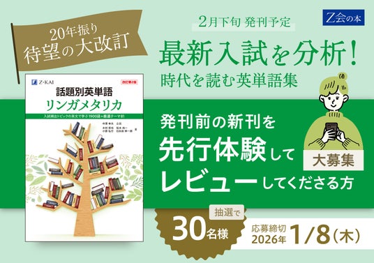 株式会社増進会ホールディングス(Z会グループ)のグループ会社、株式会社Z会ソリューションズは、長年愛され続けている『話題別英単語 リンガメタリカ』の改訂版の発刊を2025年2月20日(金)に予定しています。今回は、発売前の本品をお試し&レビューしていただける方を募集するキャンペーンを実施し、抽選で30名の方に実際に先行して体験いただきます。