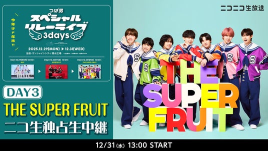 ニコニコ生放送では、年末より「つばさ男子プロダクション」による特別プログラム(全5番組)を放送いたします。 番組には、今年メジャーデビューを果たし、幕張メッセ単独公演も大盛況に終えた「THE SUPER FRUIT」、5ヶ月連続リリースや大阪移住プロジェクトなど多角的な活躍を見せた「世が世なら!!!」、そして来年1月28日に待望のデビューシングル発売を控える平均年齢16歳の新星「SHY」の3グループが生出演。 つば男メンバーとともに、賑やかな年末年始をお楽しみください!