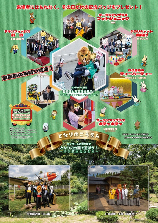 ズーラシアンブラス、サキソフォックス、弦うさぎ、クラリキャット、白ヤギ&黒ヤギ、ことふえパピヨンら出演メンバーが登場し、写真撮影やふれあいを楽しむことができます。
