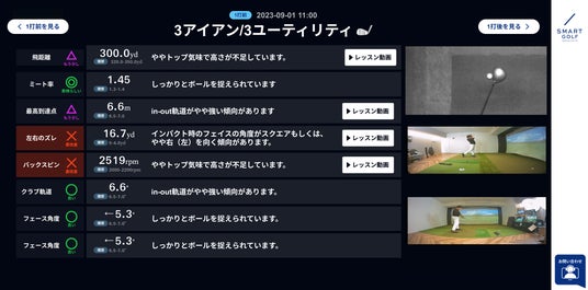 SMART GOLF独自開発の「打球診断機能」。1ショットごとに8項目の数値を評価し、改善するためのレッスン動画をレコメンドする。