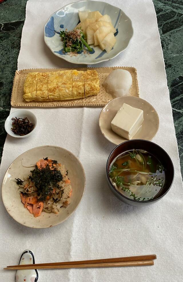 ごぼうの炊き込みご飯に焼いた鮭と素焼き海苔(全て保存してあったもの)、絹豆腐、三浦大根をヨーグルトと味噌を混ぜたもので漬けてみました(糠漬けとどっちが美味しいかなあ……)、だし巻き卵。椎茸の味噌汁。