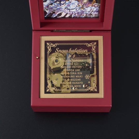 本商品は、『ラブライブ!』の2ndシングルCDとして発売され大ヒットした「Snow halation」のメロディーを奏でるオルゴールです。蓋の内側には「Snow halation」のステージ衣装を纏ったμ‘sメンバーのイラストがあしらわれています。BOXを開けるとガラス製の蓋を通して金メッキのメカが見える豪華仕様のオルゴールです。