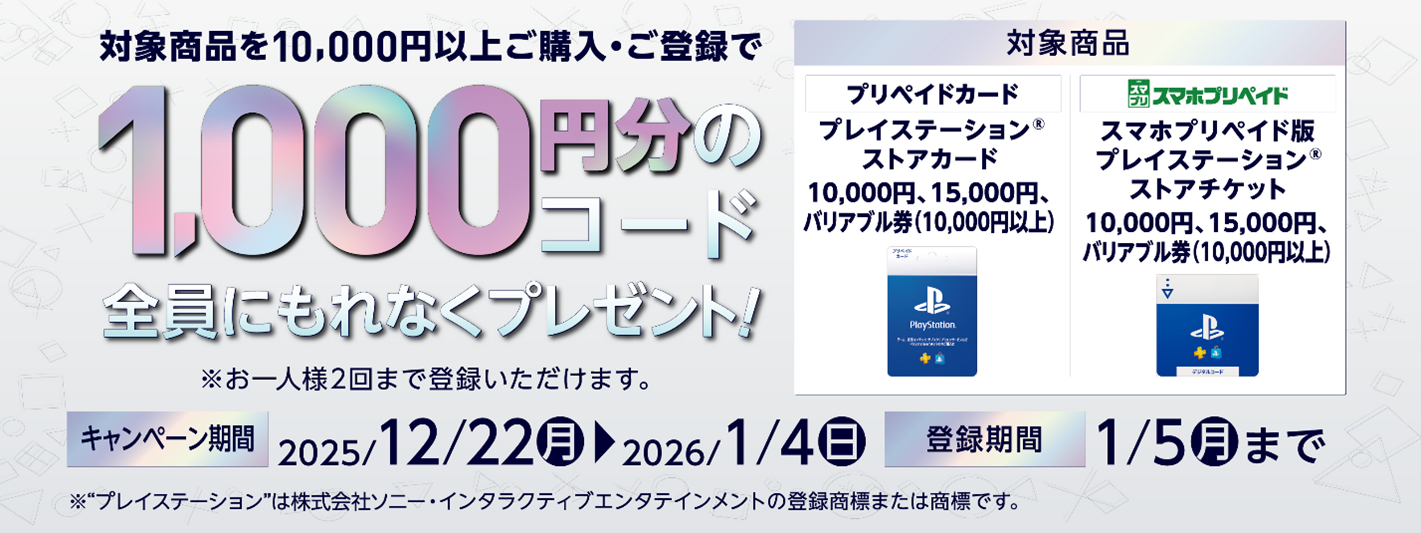 期間中に対象商品をご購入のうえ特設サイトで登録いただくと、もれなく全員にPlayStation(R) Storeで利用できる1,000円分のコードをプレゼント。冬休みや年末年始に向け、ゲームタイトルや追加コンテンツ、サブスクリプションなどをよりおトクに楽しめる期間限定のキャンペーンです。