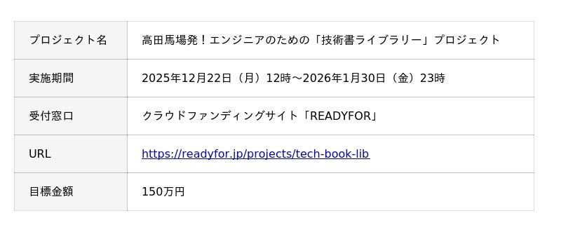 書籍と出会ったり、選んだりする手助けができる場を持続的に作っていけるよう、設備を充実させていく必要があるため、その資金についてクラウドファンディングサイト「READYFOR」にて募集を行います(https://readyfor.jp/projects/tech-book-lib)。募集期間は2025年12月22日(月)から2026年1月30日(金)まで、募集の目標金額は150万円となります。