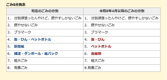 このため、令和8年4月のごみ収集より、現在の8分別の収集を変更することとなりました。