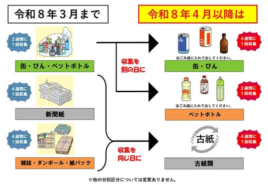 また、「新聞紙」、「雑誌・ダンボール・紙パック」の収集をまとめ、「古紙類」の収集となります。