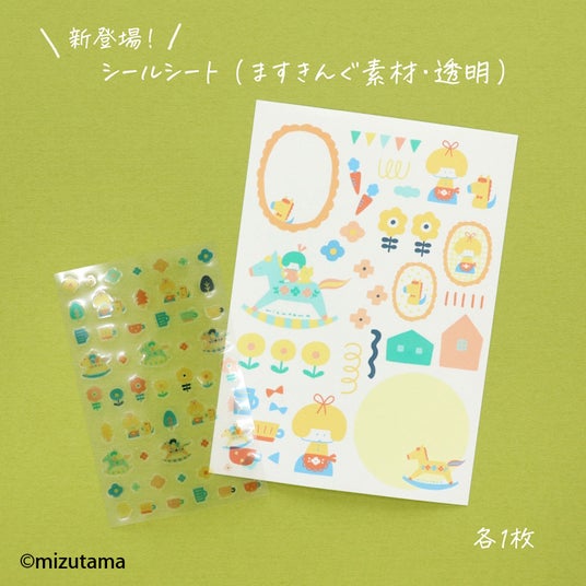 スケジュール帳やデコなど、幅広い用途でお使いいただける、透明シールシート、ますきんぐシールシートの2種類が1枚ずつ必ず入っています。